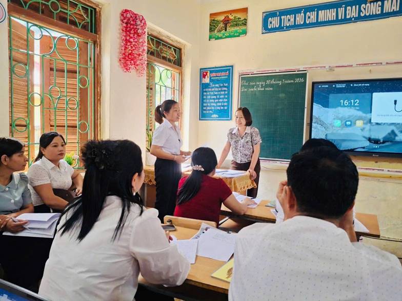 Sau tiết dạy, các thầy cô giáo đã cùng nhau trao đổi, chia sẻ những điểm mạnh cũng như góp ý chân thành để hoàn thiện hơn bài dạy. Nhiều ý kiến thiết thực được đưa ra xoay quanh việc đổi mới phương pháp, cách tổ chức hoạt động nhóm, cách dẫn dắt bài học tự nhiên và hiệu quả. Không khí thảo luận diễn ra cởi mở, thẳng thắn nhưng đầy tính xây dựng, thể hiện tinh thần học hỏi và trách nhiệm nghề nghiệp cao của mỗi giáo viên