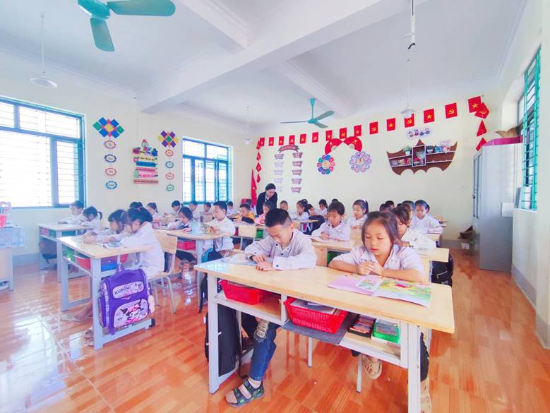 Các em học sinh tại trường PTDTBT TH Mường Pồn đang say sưa bên những trang sách