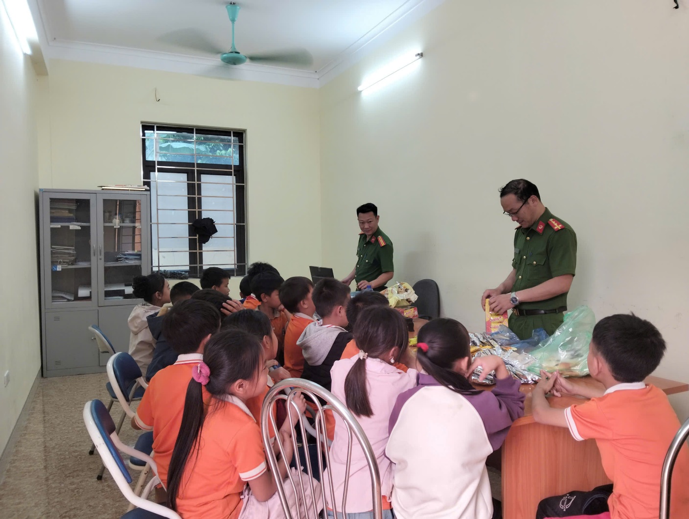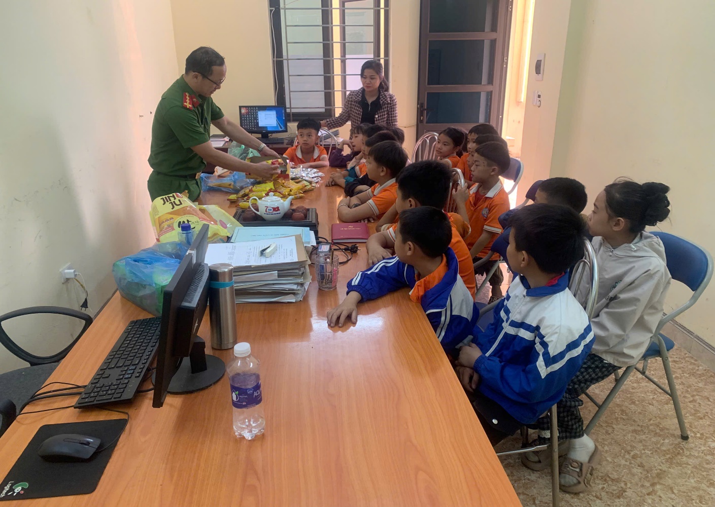 Hình ảnh các chú công an xã Mường Pồn chia kẹo cho các em học sinh